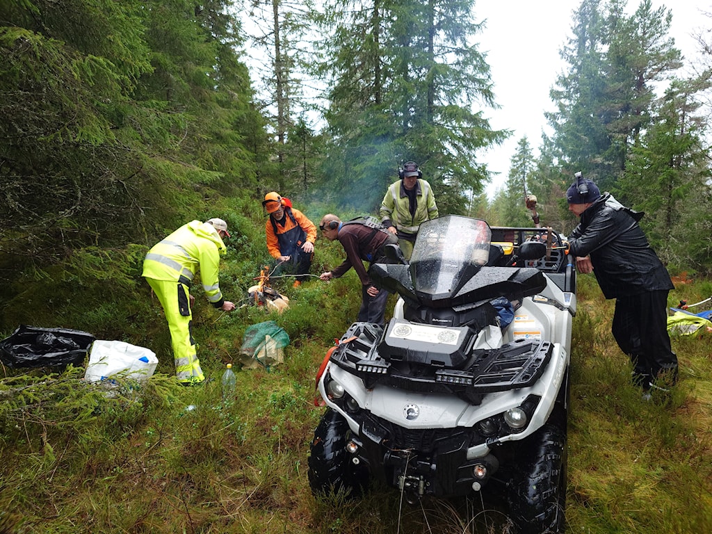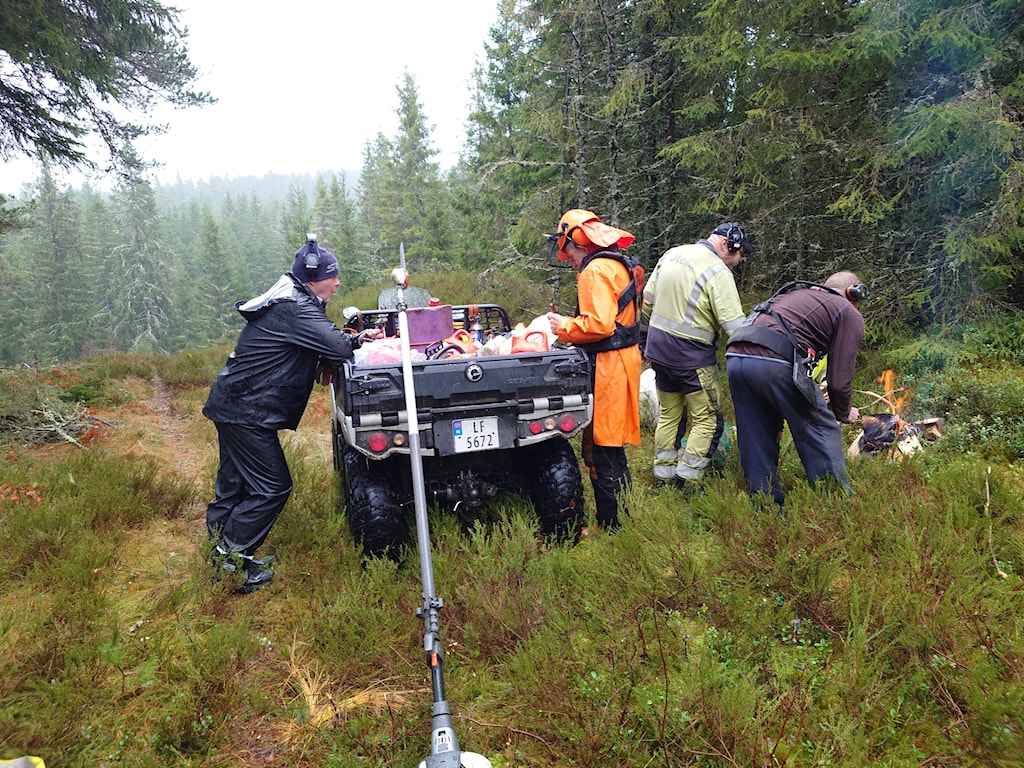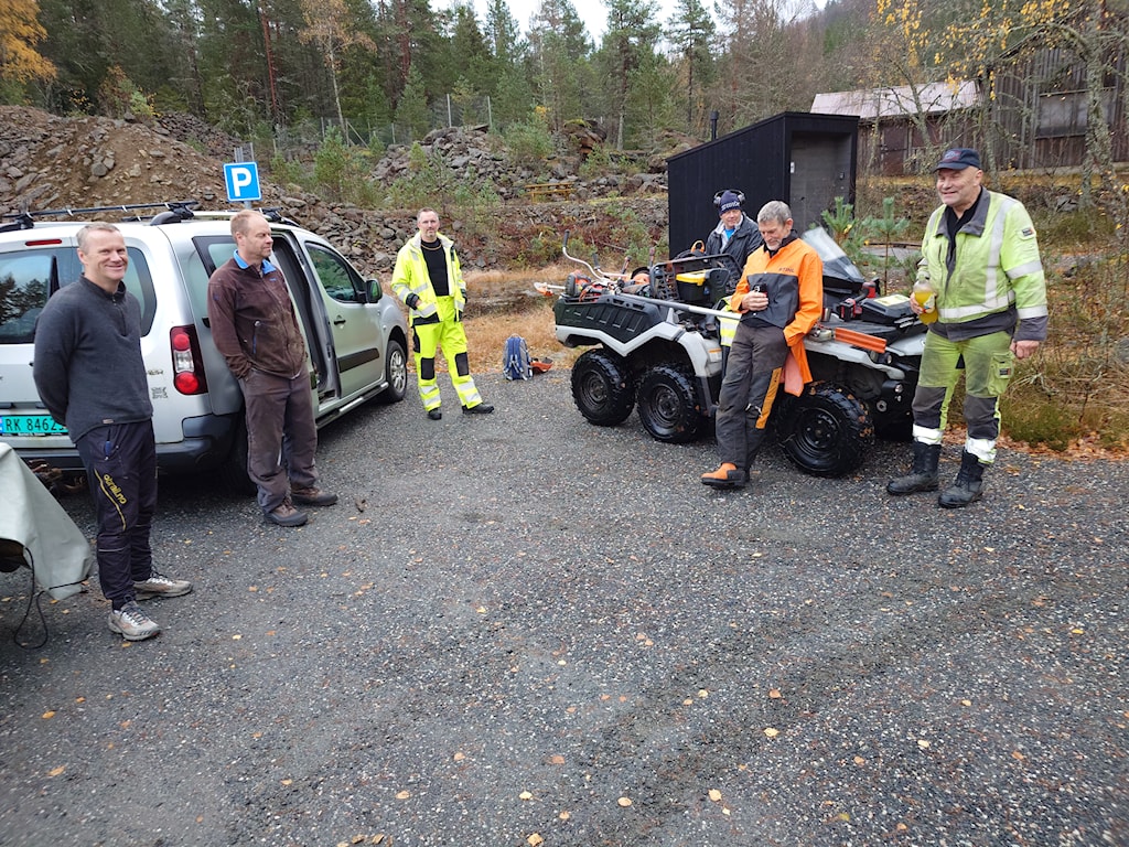 Lørdag 25. oktober var det ryddedugnad i skiløypa oppe ved Flaat Gruver. Nedre del/siste del av 10 km løypa fra Hasseldalsmyra og utfor kjøringen ned til gruva var nesten hel gjengrodd. Det er flere år siden det har blitt rydde i denne delen av løypa. To svære grantrær hadde også veltet og sperret trasèen. Sju voksne menn kunne møte, etter innkalling til dugnaden tidligere i uka. Værmelding fra Yr.no var veldig skiftende, yr, greng, bygevær, solgløtt. Det ble egentlig alt, men ikke snø. Det var bare det som manglet. Bålet var på plass, pylse pinner osv.