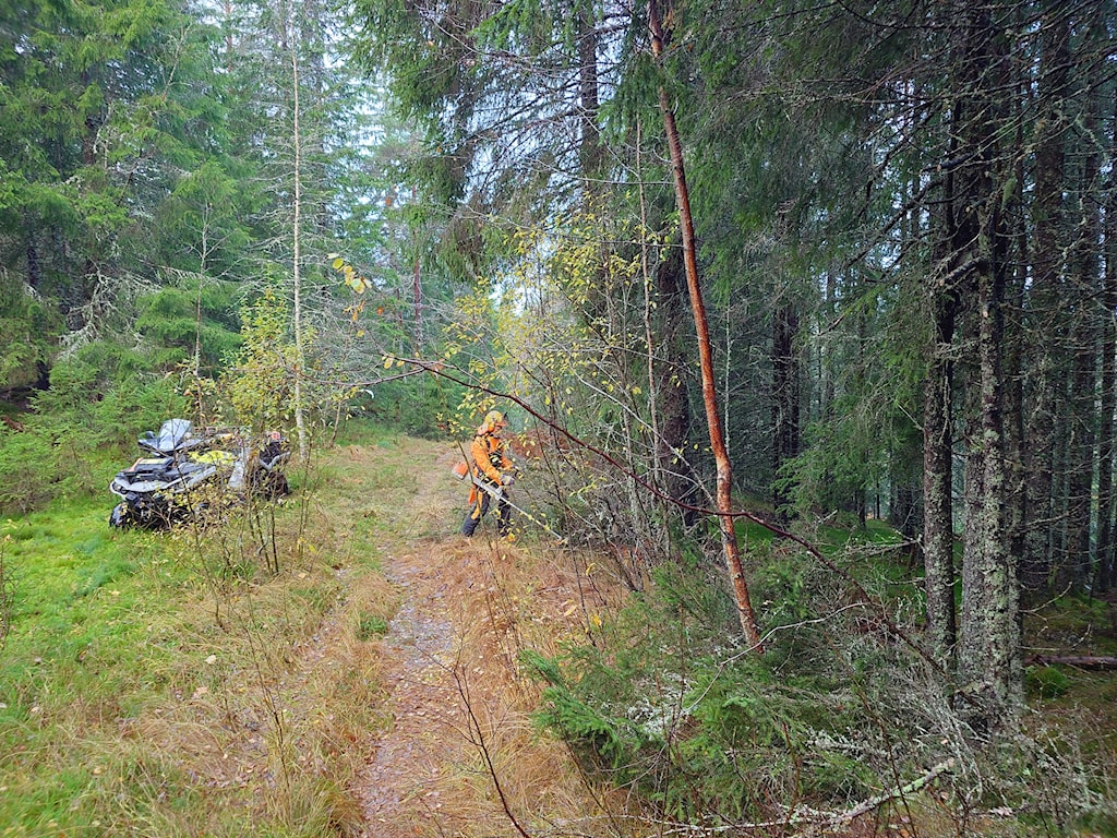 Torgeir Uleberg i gang med ryddesaga i utforkjøringen ned mot gruva. Nok av greiner, rønninger, mye å rydde.